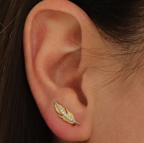 Un modèle de boucles qui se porte en continuité du lobe de l'oreille. Un bijou délicat en forme de plumes parcouru de pierres brillantes pour un rendu élégant et éclatant.