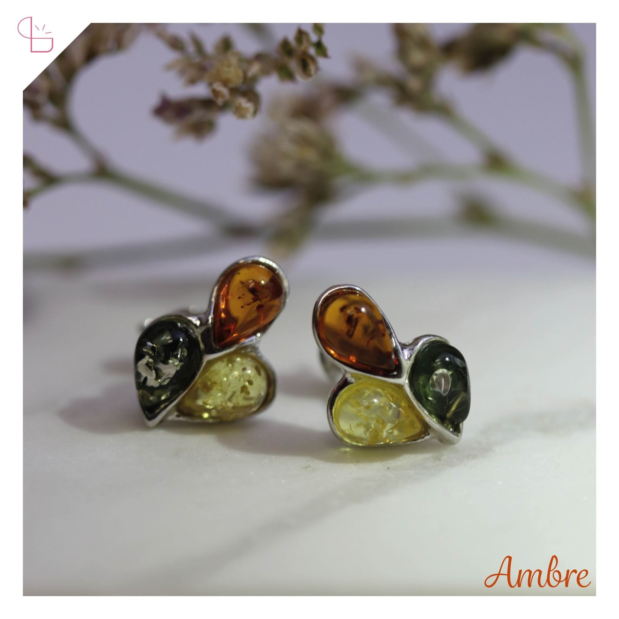 De ravissantes boucles d'oreilles en argent rhodié 925/1000. Ces jolies puces regroupe 3 gouttes d'ambres, de trois teintes différentes (cognac, vert et miel).