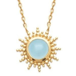 On adore ce magnifique collier en plaqué or tout en finesse. Sur une chaîne en maille forçat , on retrouve en son centre un superbe pendentif en forme de soleil délicatement perlé et réhaussé d'une belle agate ronde bleue. Un bijou aux teintes pastelles que l'on voudrait toutes avoir.