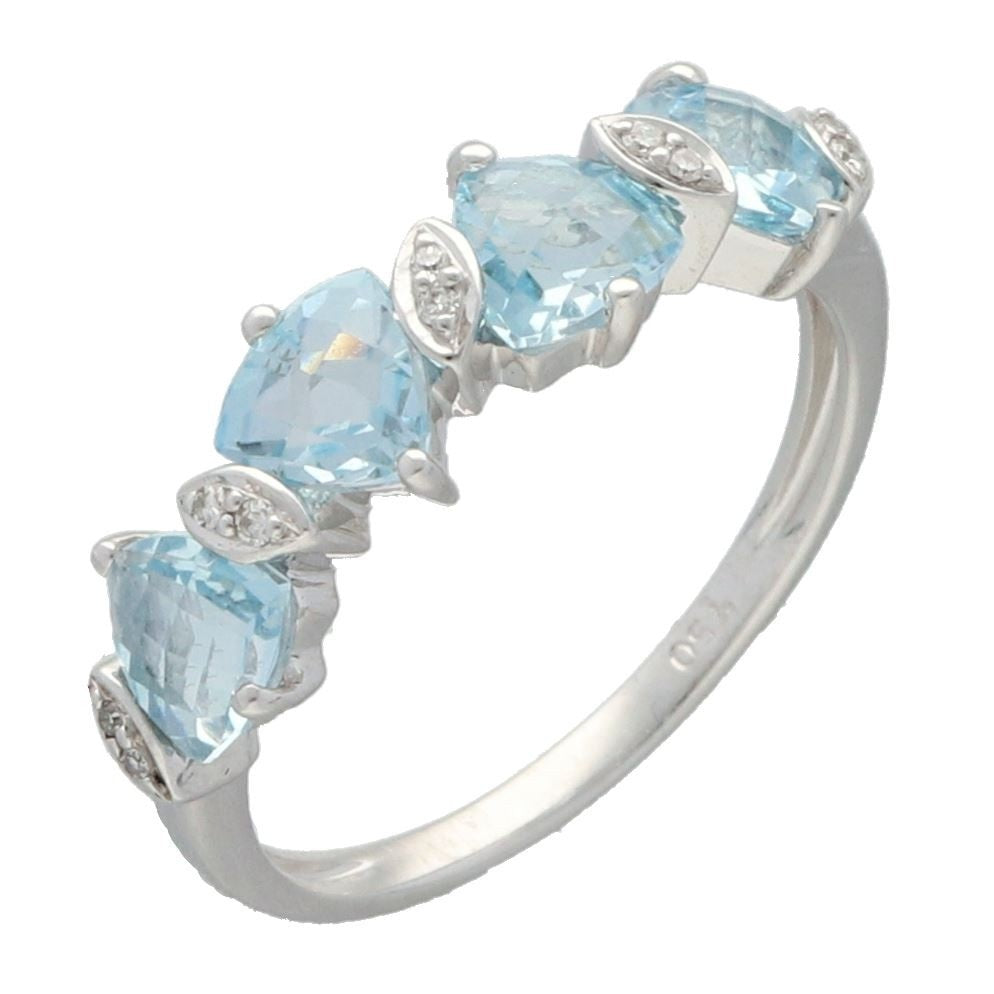 Vous serez sous le charme de cette superbe bague en or blanc 750/1000ème (18 carats) ! Son originalité : la disposition de ses pierres et l'alternance topaze et diamant. Un bijou élégant qui embellira toutes vos tenues avec éclat !