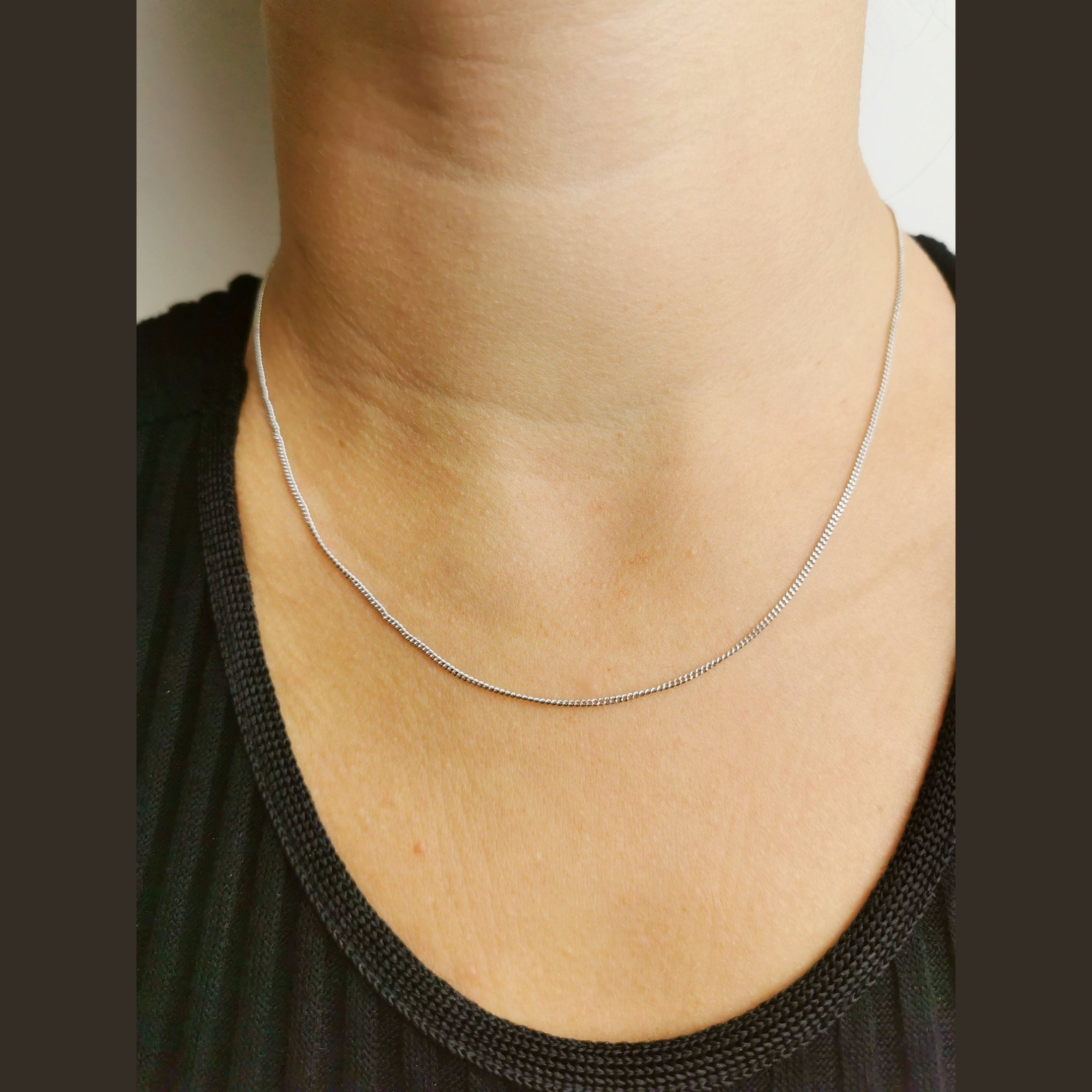 Une chaine en argent rhodié 925/1000. Une maille gourmette classique avec un fermoir mousqueton. De 45 centimètres de longueur, cette chaine pourra se porter seule ou accompagnée d'un pendentif.