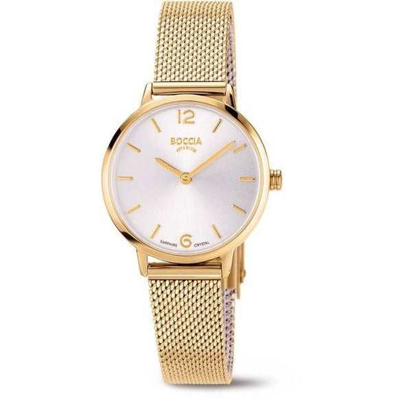 Vous serez sous le charme de la montre pour femme 3345-03 de chez BOCCIA. Son boîtier en titane doré renferme un cadran rond argenté de 28 mm de diamètre. Ses aiguilles et ses indexes sont dorés. Ces derniers sont en forme de bâton en dehors du 12 et du 6 qui sont en chiffres. La touche finale est apportée par le bracelet doré en acier avec sa maille milanaise. Cette montre se mariera avec toutes vos tenues, des plus simples aux plus habillées. Enfin, cette montre est étanche 5 ATM, soit l'équivalent de la résistance à la pression exercée par l'eau à 50 mètres de profondeur. Bien plus qu'une montre, elle devient un véritable accessoire de mode.