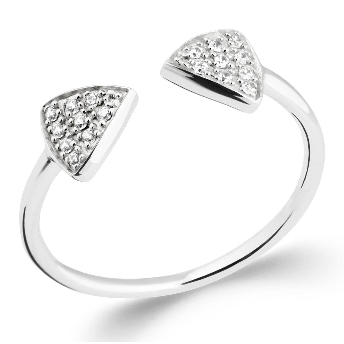 Une jolie bague discrète ouverte sur le dessus : les deux extrémités en forme de triangles sont pavés d'oxydes blanc lumineux.