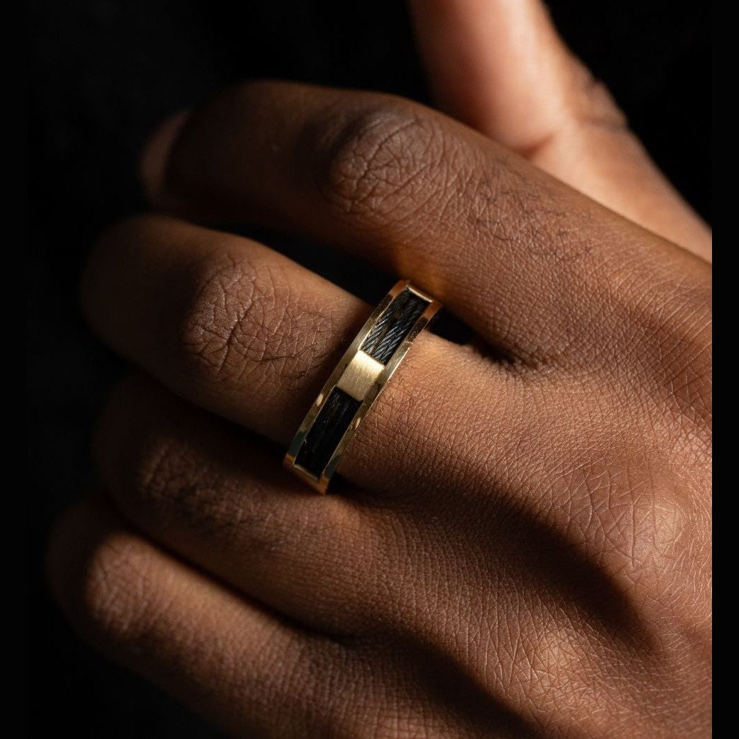 Misez sur l'originalité de cette bague en acier doré dans laquelle se trouve 3 cables noirs. Un bijou résolument masculin et résistant !