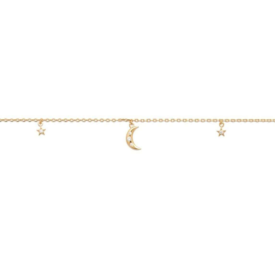 Superbe chaine de cheville en plaqué or ornée de pampilles lune et étoiles serties d'oxydes de zirconium. Un bijou moderne et délicat qui saura habiller votre cheville !