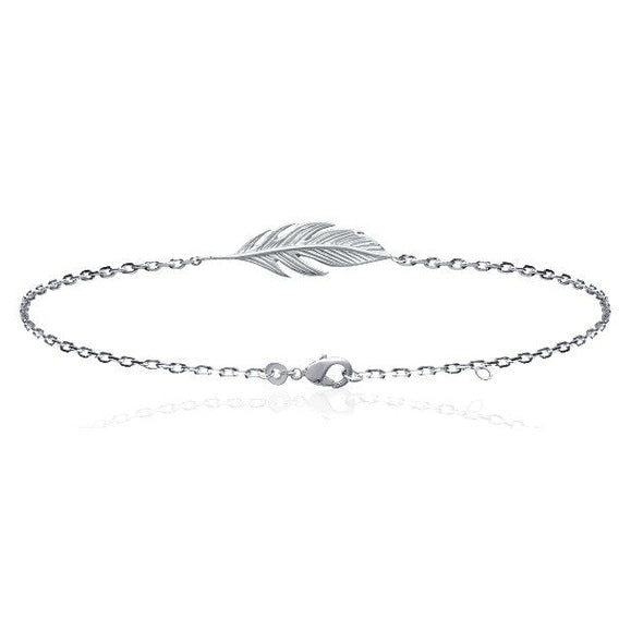 Un bracelet souple en argent rhodié de 18cm de longueur en maille forçat orné d'une plume au centre du bijou. Un modèle fin et délicat que vous ne pourrez plus quitter.