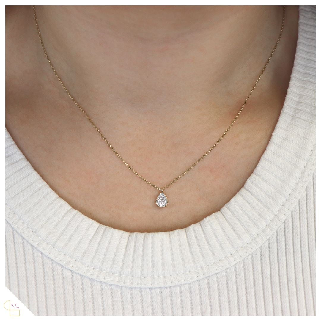 Discret et intemporel, craquez pour ce joli collier en or 375/1000e et son pendentif en forme de goutte serti pavage de diamants. Un collier étincelant !