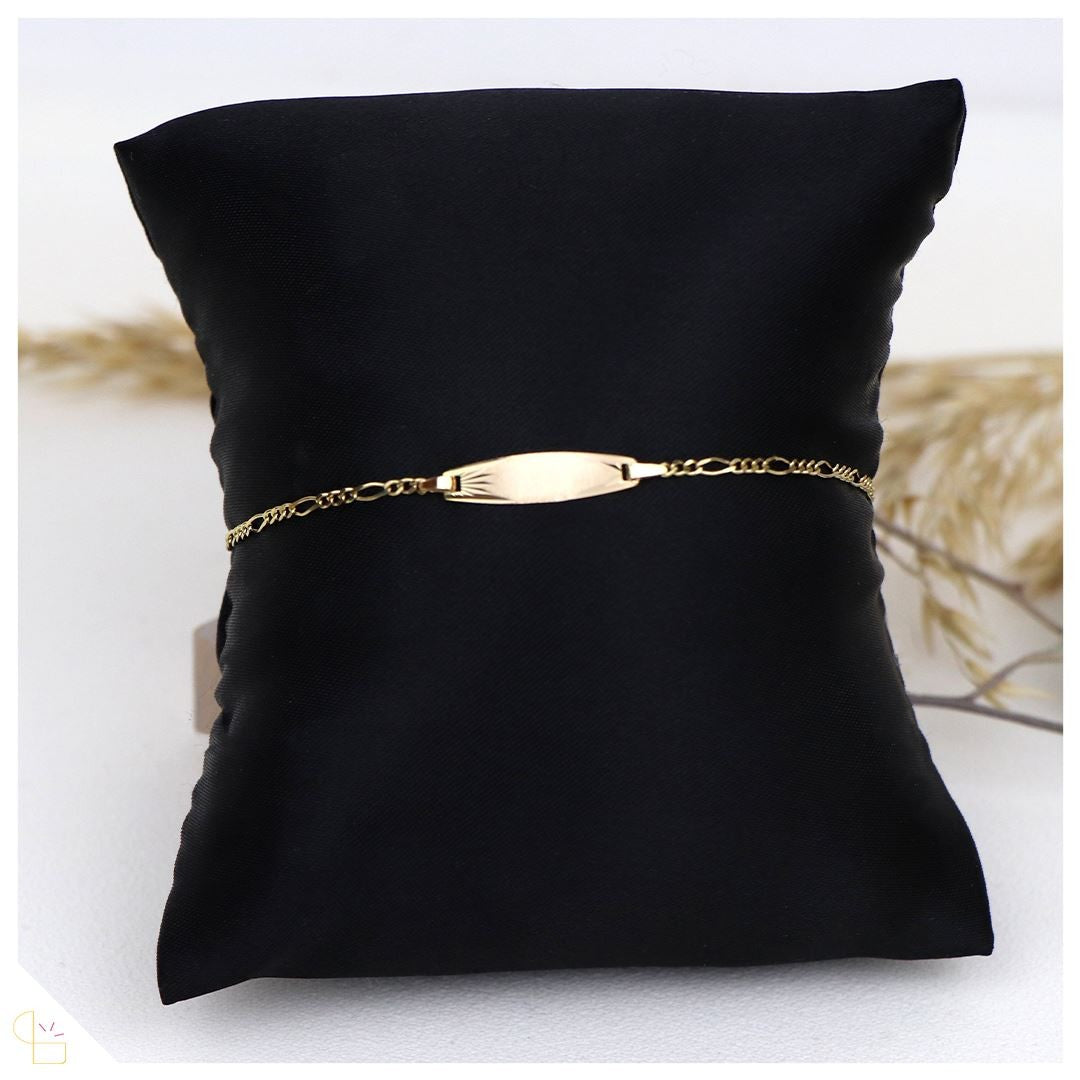 Vous aimerez cette gourmette pour enfant en or jaune 750/1000 qui est toute en élégance. L'association de sa chaîne en maille Figaro qui alterne 3 petits maillons et 1 grand, ainsi que sa plaque ovale font d'elle un bijou travaillé et moderne. Ce bracelet mesure 14 cm avec un anneau intermédiaire placé à 12 cm pour qu'il puisse s'adapter à tous les poignets.