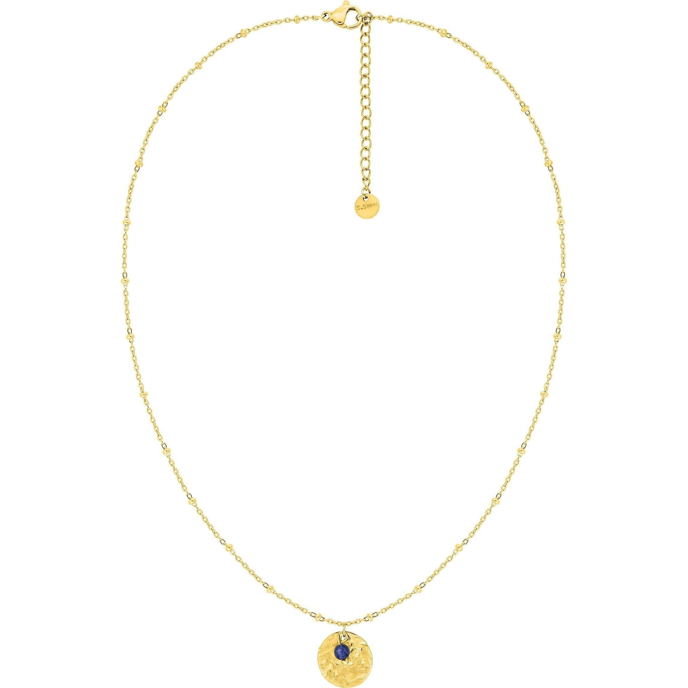 Misant sur la simplicité, ce collier en acier doré est composé d'une chaîne forçat avec des petites billes et d'un pendentif rond martelé sur lequel se repose une bille de lapis lazuli.