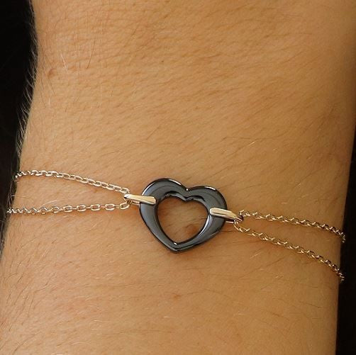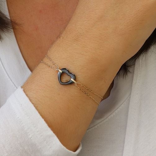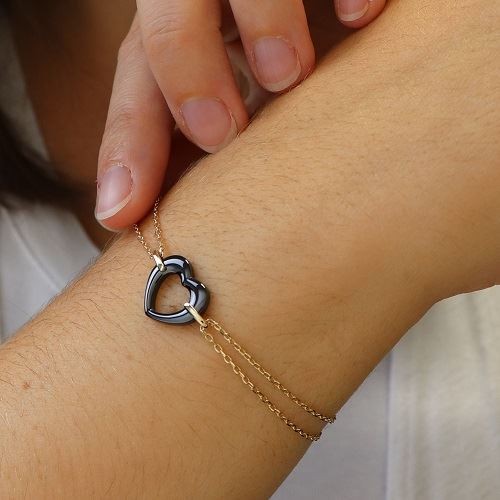 Ce joli bracelet allie à merveille le doré du plaqué or et le noir de la céramique. Ce bracelet fin se compose d'une double chaîne en maille forçat au centre duquel se trouve un cœur ajouré en céramique. Un bijou résolument romantique que vous pourrez offrir à un être cher.