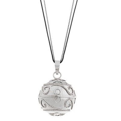 Craquez pour ce magnifique bola de grossesse tout en argent 925/1000 et ses motif travaillés tout en relief. Son double cordon noir et argenté de 110 cm est complètement réglable.