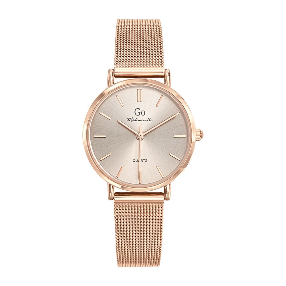 Avec sa silhouette classe et épurée, impossible de ne pas craquer pour cette montre Go Mademoiselle 695431 ! Équipée d'un joli boîtier rond et doré rose de 32 mm de diamètre, ce dernier se lie à un magnifique bracelet en maille milanaise de la même couleur. L'atout charme de cette montre c'est bien sûr son lumineux cadran doré rose, sublimé par d'envoutants reflets soleil apportant grâce et finesse au modèle. Féminine et tendance, cette montre Go Mademoiselle 695431 vous accompagnera au quotidien !