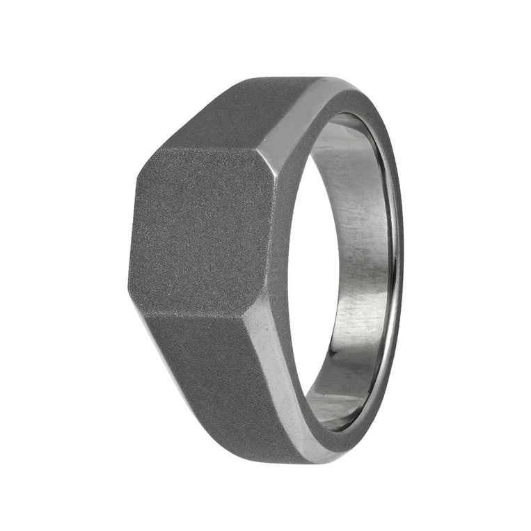Découvrez cette magnifique chevalière forgée en tantale. Elle allie un centre mate effet sablé à des bords légèrement bisotés lisses et polis. Un bijou original que vous pouvez personnaliser pour le rendre unique !