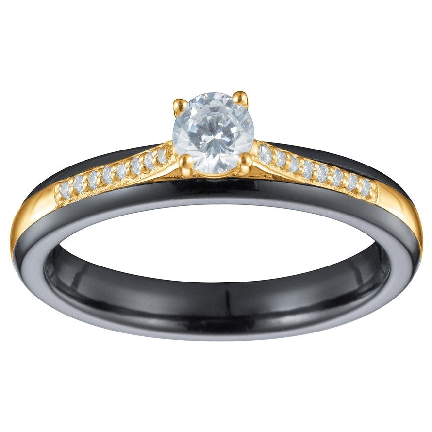 Vous serez sous le charme de cette ravissante bague de style solitaire accompagné. Le corps de la bague, large de 3mm, associe à la perfection le noir de la céramique et le doré du plaqué or. Le tout est surmonté d'un joli oxyde de zirconium blanc lequel est entouré de plusieurs autres plus petit. Ce bijou prend toute son originalité de par sa couleur noire qui réhausse l'éclat des oxydes.