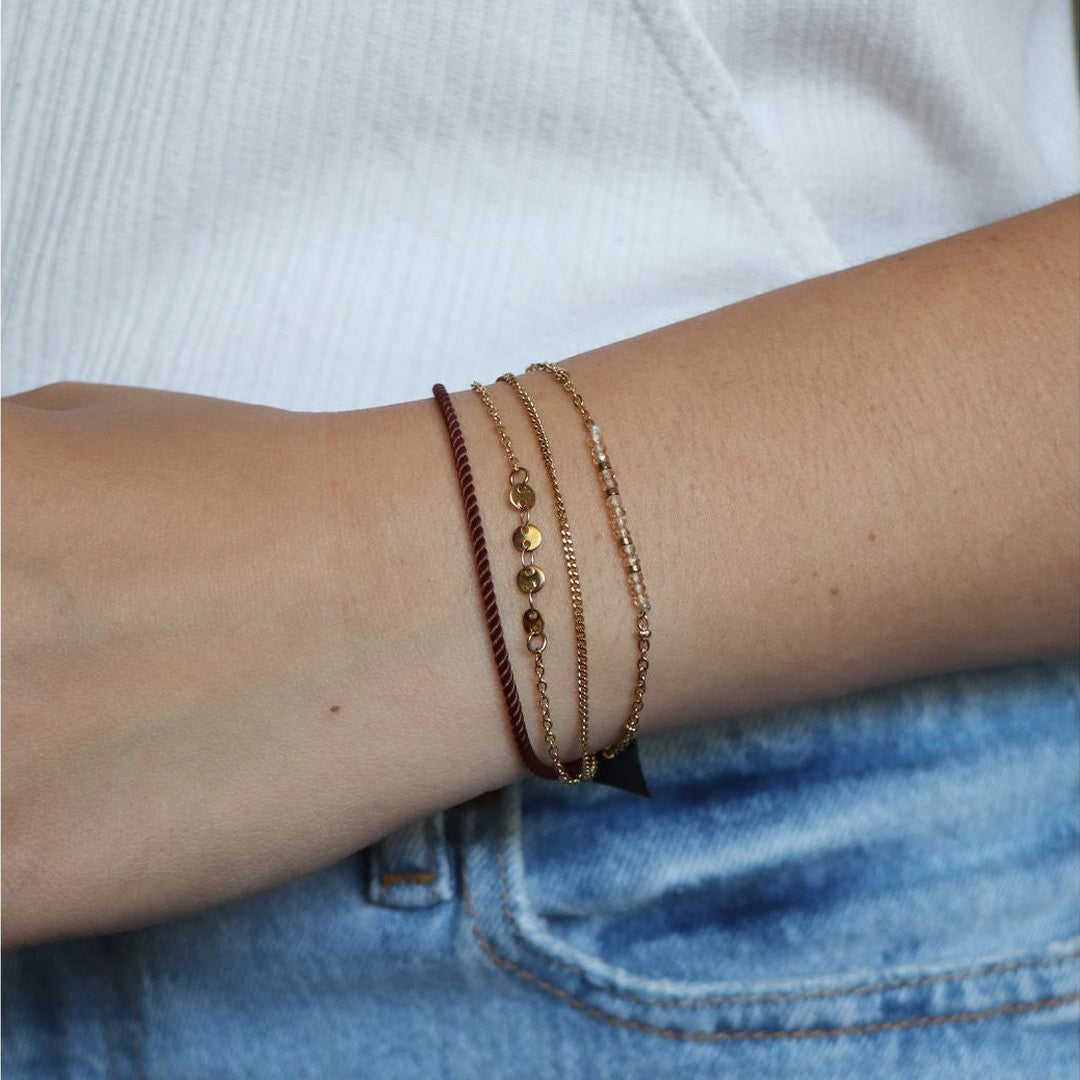 Ce bracelet multi-rangs en acier doré joue sur les matières et les textures pour un style moderne et élégant. Il associe une chaîne maille gourmette fine, une chaîne maille forçat ornée de petites pastilles dorées, un cordon tressé nylon couleur brique et une rangée de perles facettées aux reflets bruns et irisés. Un bijou tendance idéal pour rehausser un look casual chic !