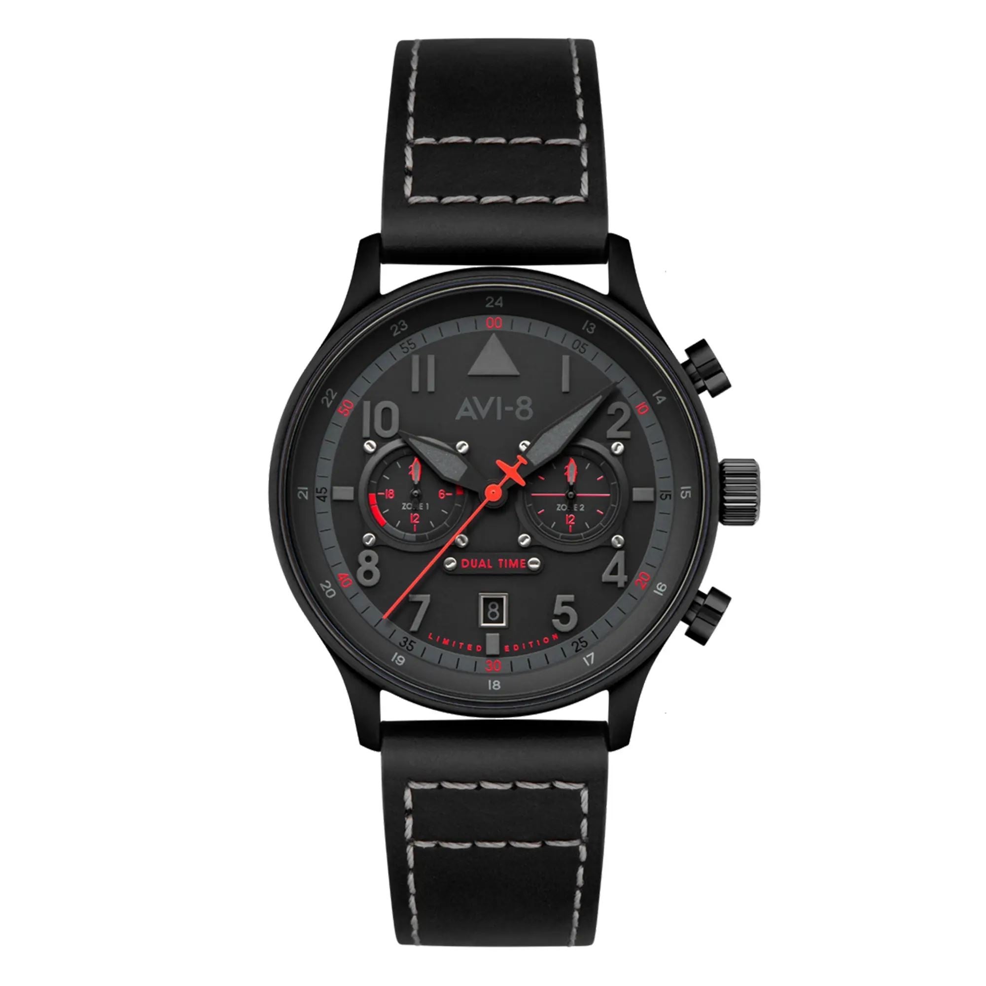 Nous vous proposons de découvrir la montre homme HAWKER HURRICANE AV-4088-05 avec son boîtier en acier inoxydable noir, son cadran noir et son bracelet en cuir véritable noir. Pourvue d'un verre minéral, cette montre est étanche 5 ATM, soit l'équivalent de la résistance à la pression exercée par l'eau à 50 mètres de profondeur. Elle est également équipée d'un mouvement à quartz japonais avec double fuseau horaire. La date se situe à 6h. Une touche de couleur est apportée par la trotteuse qui est rouge et en forme d'avion.