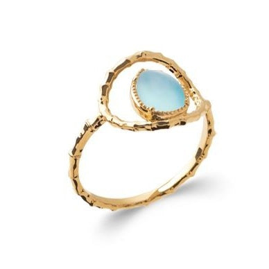 Succombez à cette bague en plaqué or à la finition martelée. Elle se compose d'un cercle ajouré au centre duquel se trouve une jolie agate bleue en forme de poire. Elle apportera une touche de couleur à vos tenues tout en restant sobre et discrète.