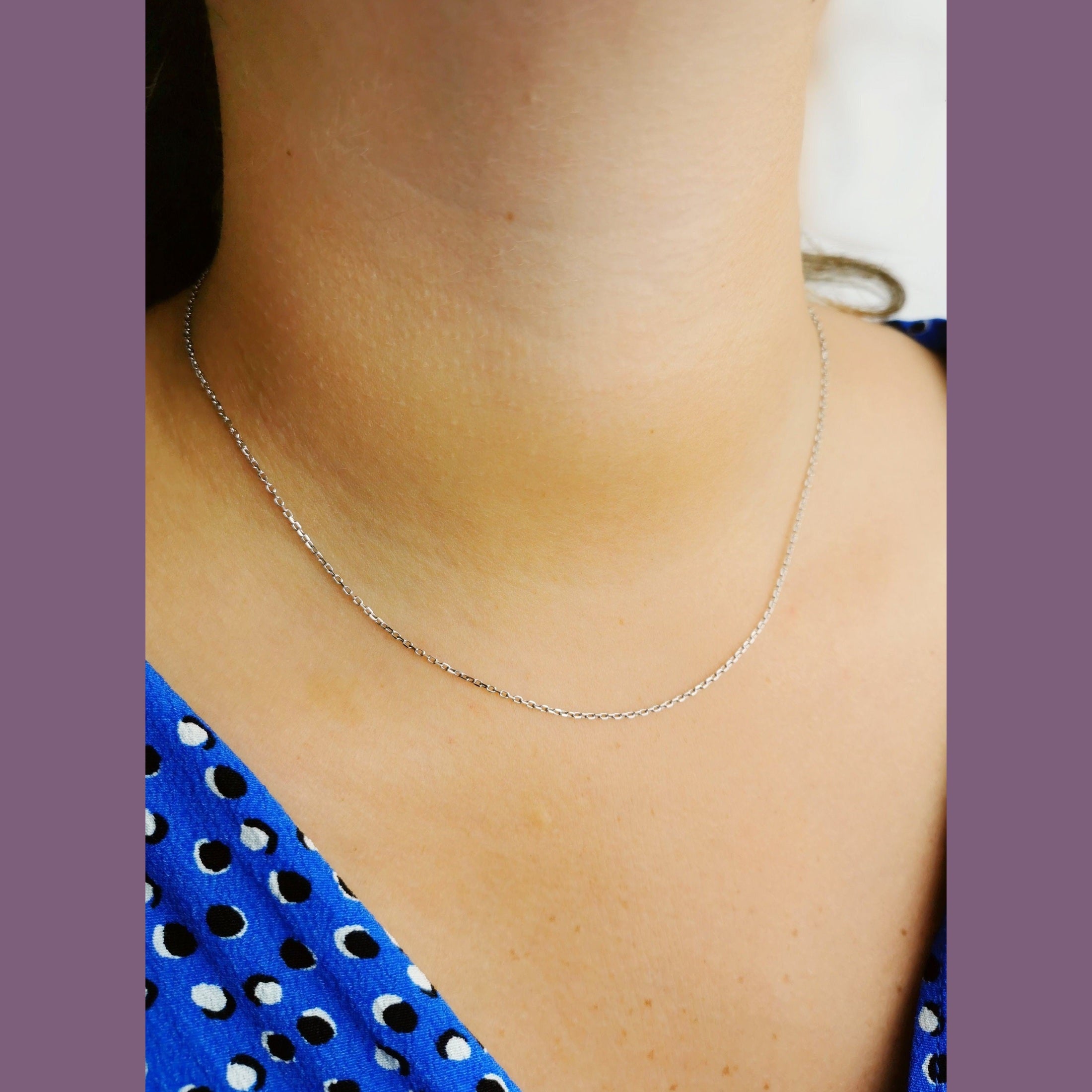 Une chaine en argent rhodié 925/1000. Une maille forçat classique avec un fermoir mousqueton d'une longueur de 45 cm. Elle peut être portée seule ou avec un pendentif de votre choix.