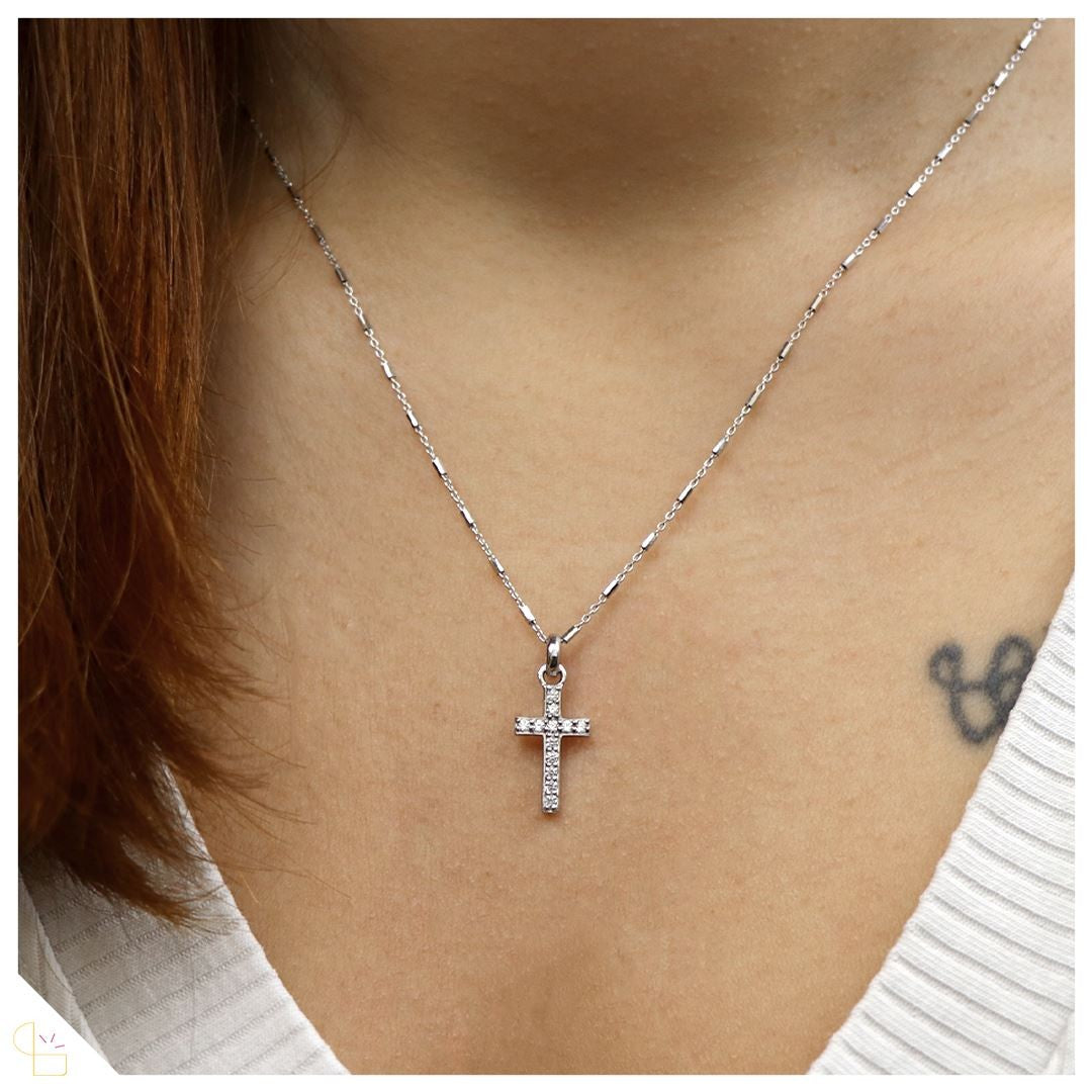 Très jolie croix en argent rhodié 925/1000 recouverte d'oxydes de zirconium brillants. Un modèle délicat et symbolique.