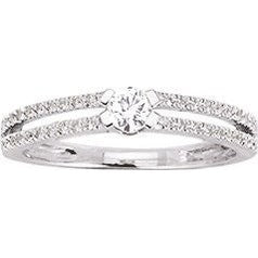 Impossible de résister à ce magnifique solitaire en or blanc 750/1000è. Son corps de bague se sépare en deux rangs sertis de diamants qui viennent mettre en avant un diamant central lumineux serti 4 griffes.