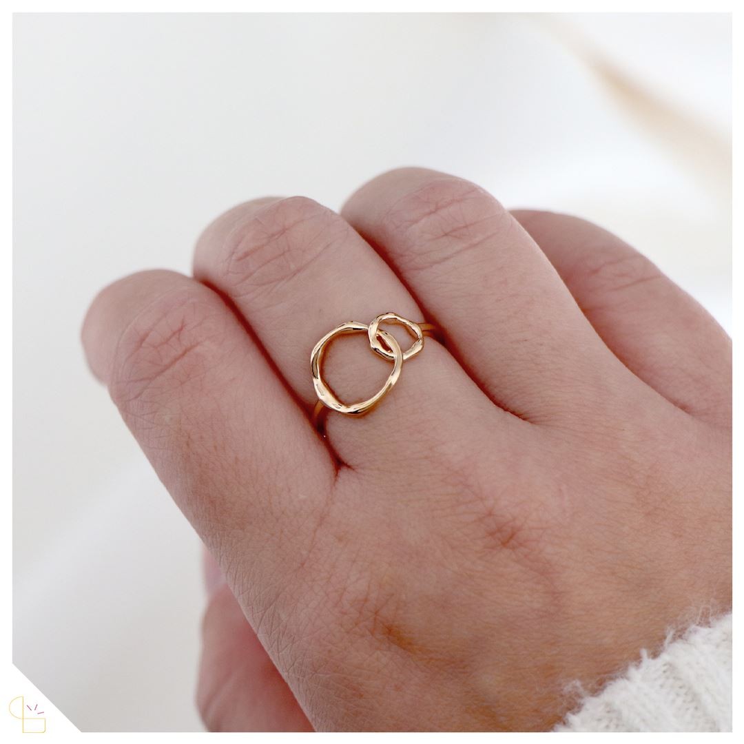 Superbe bague en plaqué or, les deux cercles entrelacés ont une finition travaillée, presque martelée, qui vient capturer la lumière. Un bijou simple et intemporel.