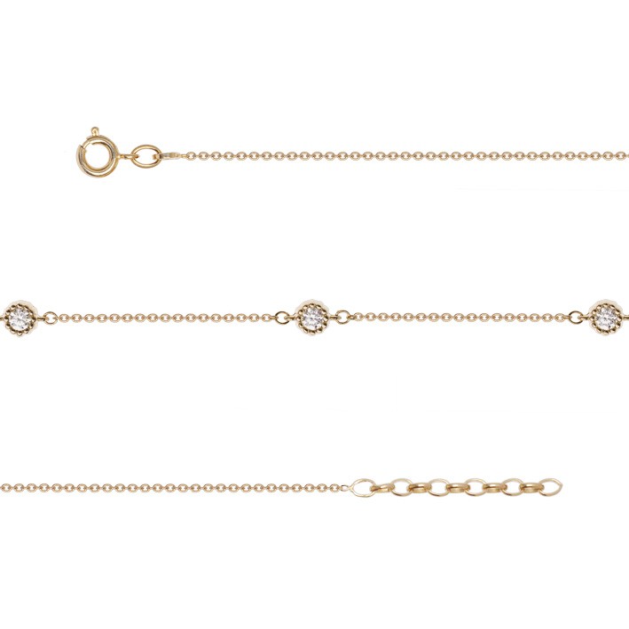 Une chaîne de cheville fine en plaqué or jaune, elle est ornée d'oxydes de zirconium brillantes sertis clos perlés pour une touche de luminosité. Un bijou simple qui fera toute la différence une fois porté !