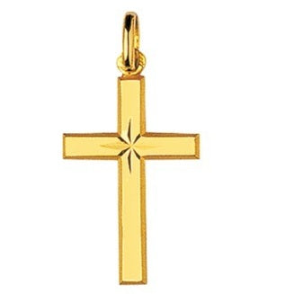 Superbe pendentif en plaqué or en forme de croix. Ses bords sont biseautés et au centre se trouve une étoile gravée. Un bijou travaillé qui pourra être associé à la chaine de votre choix.