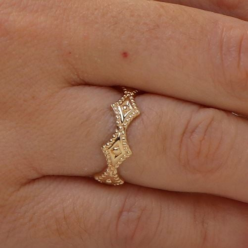 Une bague en plaqué or au corps de bague original. Sa forme représente plusieurs losanges perlés les uns à la suite des autres, Cette bague vous fera penser à une couronne.