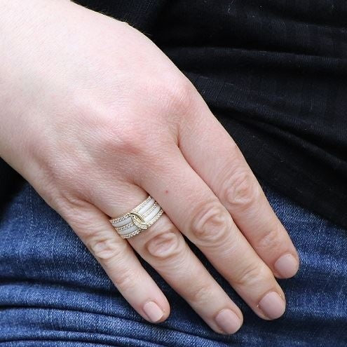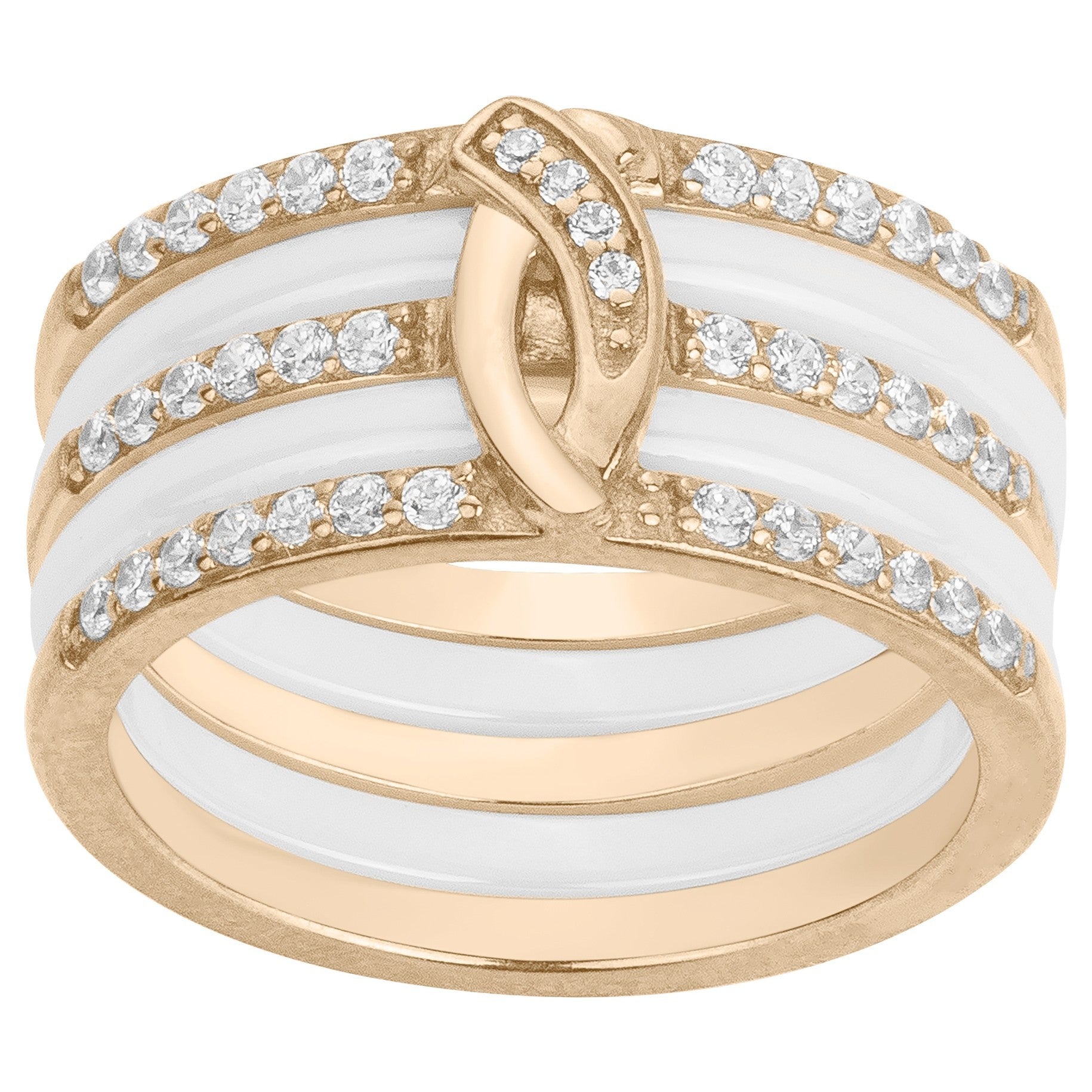 Vous ne serez pas indifférent au charme de cette ravissante bague pour femme tout en trompe l'œil. En effet, cette bague large se compose de plusieurs anneaux : 2 en plaqué or qui sont sertis d'oxydes de zirconium blancs et 3 en céramique blanche. Les anneaux sont alternés et soudés entre eux. On trouve également sur le dessus un lien en plaqué or qui est également serti d'oxydes de zirconium. On apprécie l'association des 2 matières qui se subliment l'une l'autre