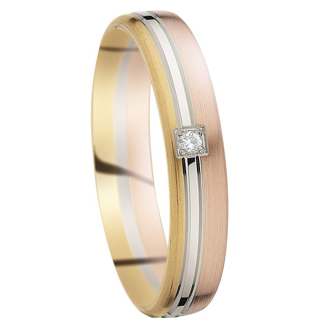Vous serez sous le charme de cette superbe alliance qui allie l'or jaune, rose et blac 750/1000ème à la perfection. L'aspet de l'anneau est brossé, seul la bande intérieure en or blanc est quand à elle polie. Retrouvez également en son centre un superbe diamant de 0.017 carat qui apportera la touche d'éclat à cette alliance.