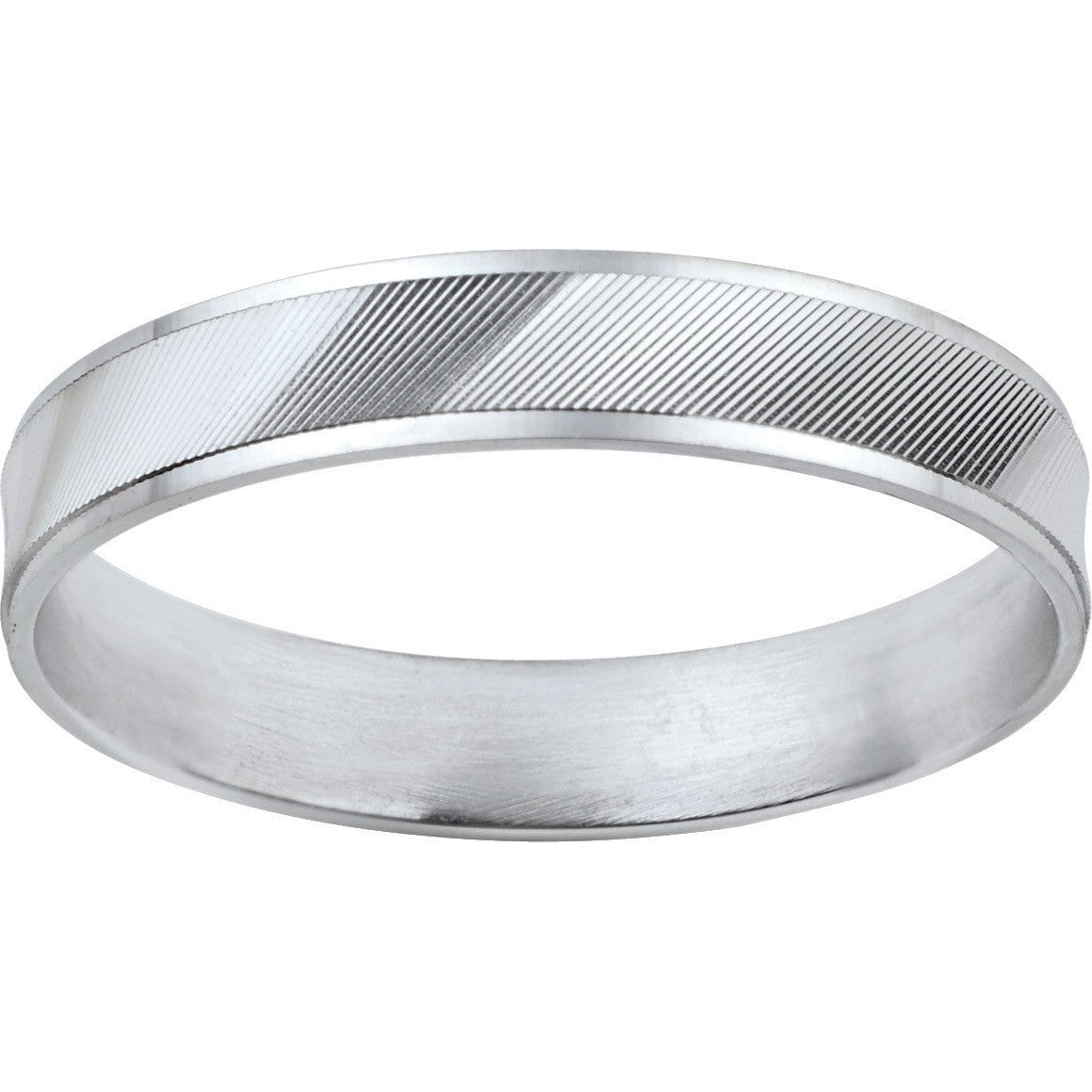 Rien de plus renversant que cette superbe alliance en or blanc 750/1000ème et dont son centre est entièrement strié en diagonale afin de lui apporter plus de relief. Ainsi le centre de l'alliance jouera avec les différences de luminosité, donnant l'impression d'un effet satiné.