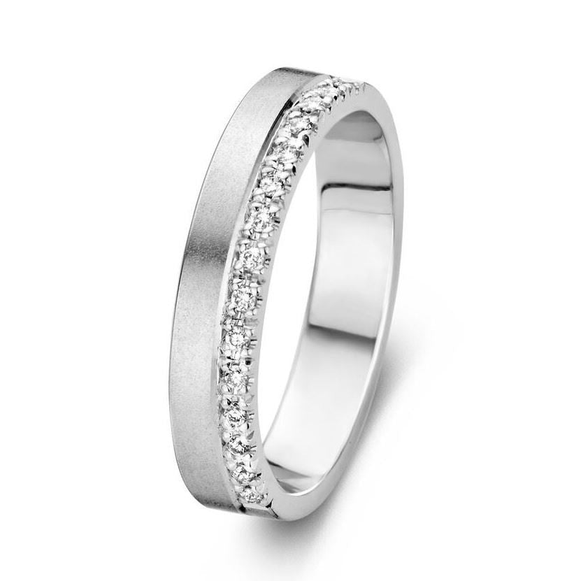 Cette alliance en or blanc 750/1000è se compose de deux bandes : une bande plus large en or blanc mate qui vient contraster une bande sertie rail demi-tour de diamants étincelants de 0.12cts. Une alliance aux bandes complémentaires à l'image de votre amour.