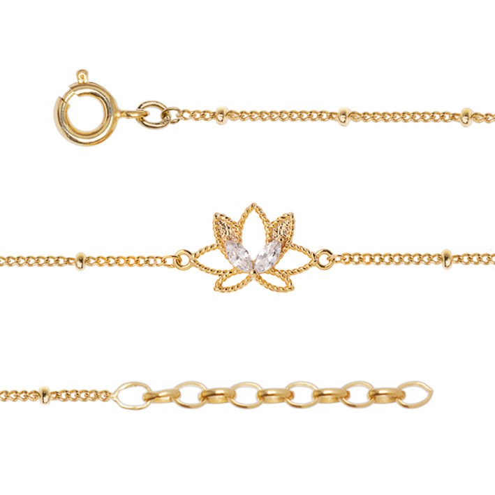 Habillez votre cheville de cette jolie chaîne en plaqué or jaune. Elle se compose d'une maille forçat bille et d'un motif feuille de lotus tressé orné de deux oxydes de zirconium navette.