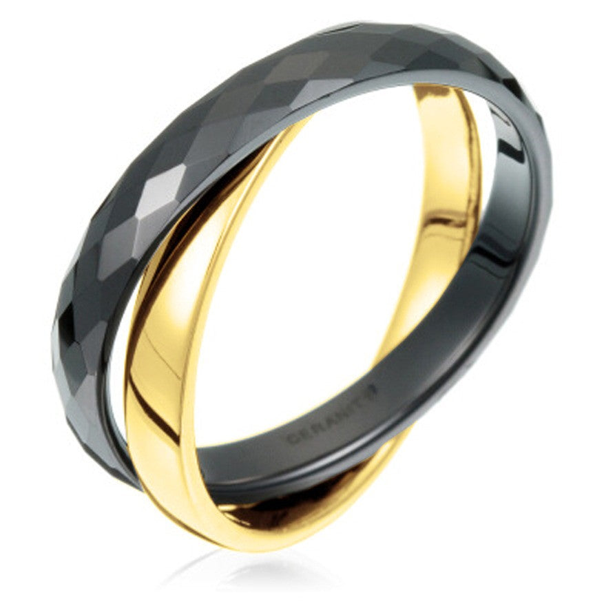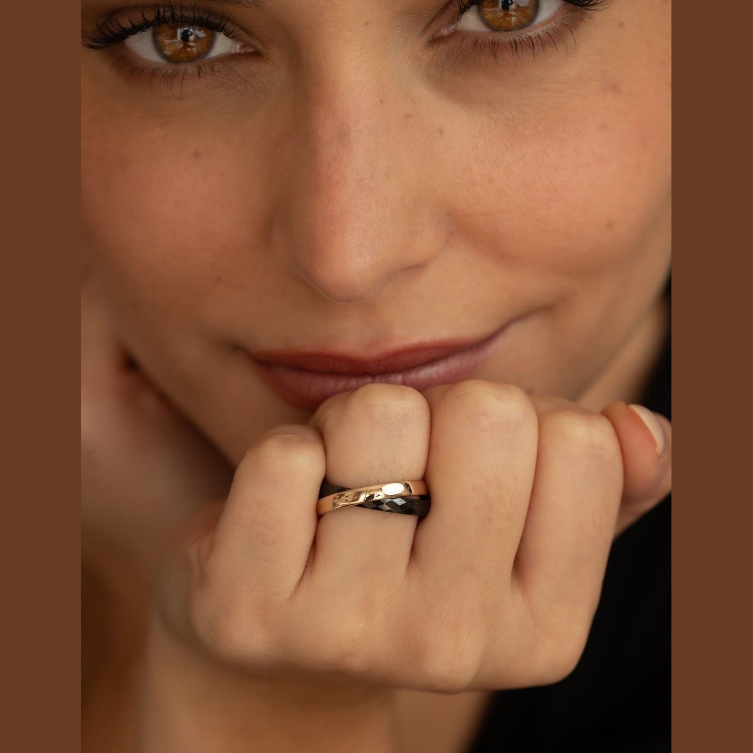 Affirmez votre style avec cette bague contemporaine au design contrasté. Composée de deux anneaux entrelacés, l'un en plaqué or lisse et l'autre en céramique noire facettée, elle allie audace et élégance. Un bijou graphique et moderne, parfait pour celles et ceux qui aiment se distinguer avec subtilité.