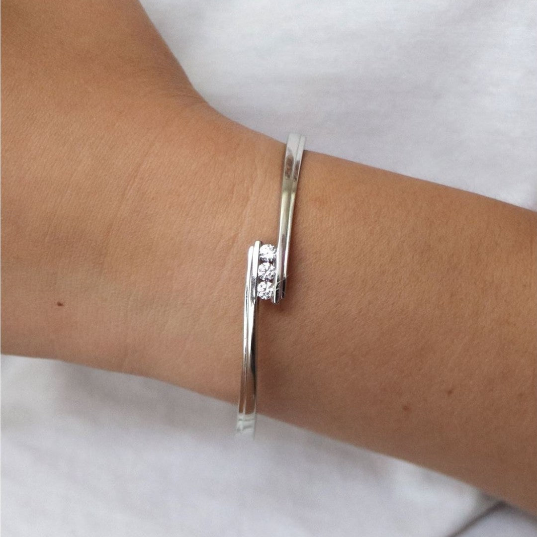 Craquez pour ce jonc en argent rhodié 925/1000è. Un bijou tout en délicatesse serti d'une trilogie d'oxydes de zirconium ronds. Un bijou délicat et intemporel avec un système d'ouverture facile vous permettant de le mettre et de l'enlever rapidement.