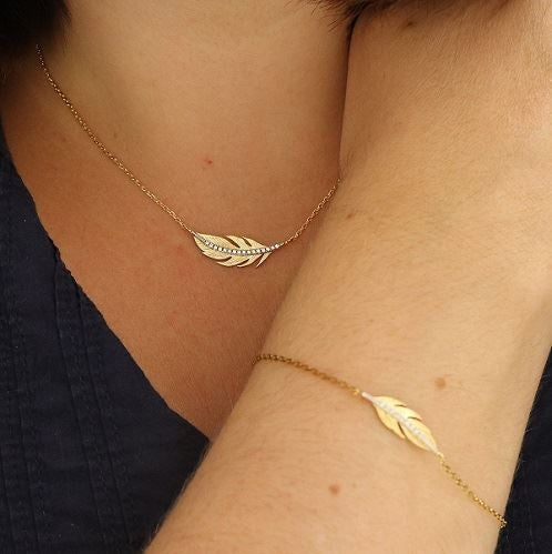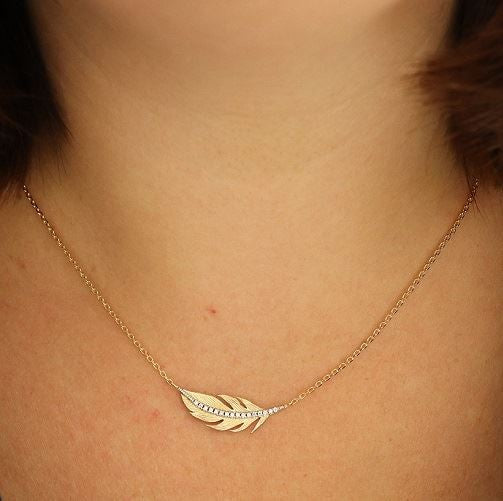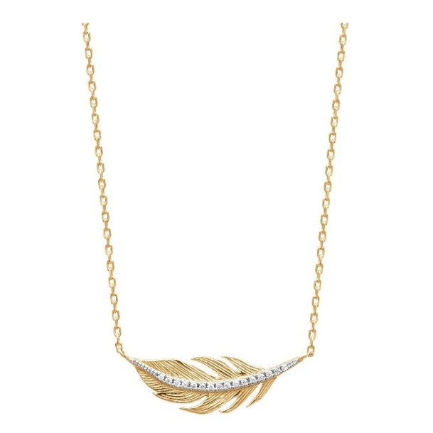 Superbe collier en plaqué or jaune 3 microns de 45 centimètres de longueur. Un modèle avec un pendentif en forme de plume recouverte d'une ligne d'oxydes de zirconium brillants et éclatants. Un bijou élégant et délicat, un incontournable.