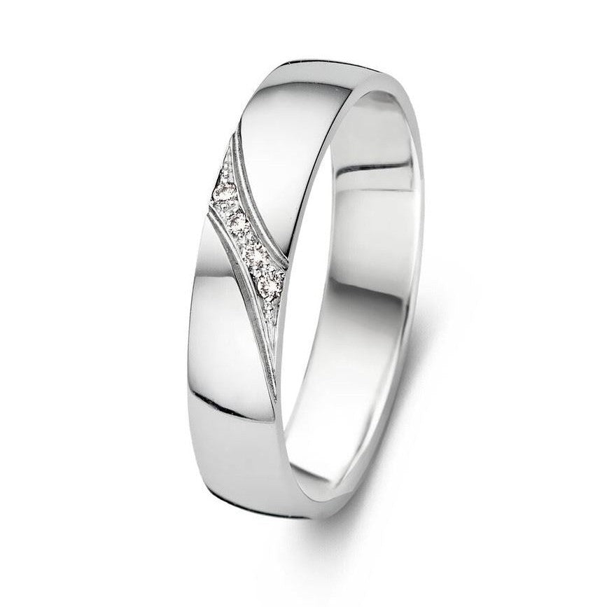 Un modèle d'alliance simple en or blanc 750/1000è lisse et poli traversé par une diagonale de diamants sertis grain. Un modèle lumineux et intemporel, symbole de votre union.
