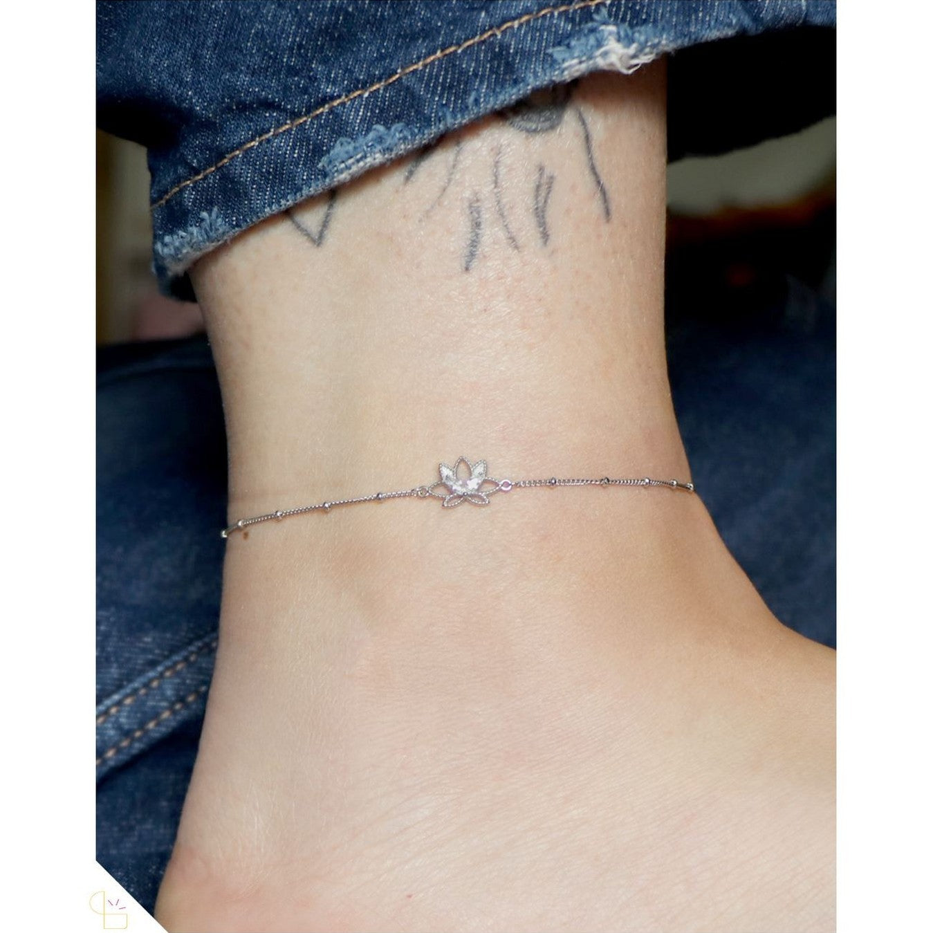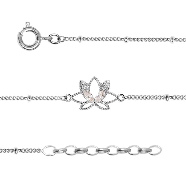 Habillez votre cheville de cette jolie chaîne en argent rhodié 925/1000è. Elle se compose d'une maille forçat bille et d'un motif feuille de lotus tressé orné de deux oxydes de zirconium navette.