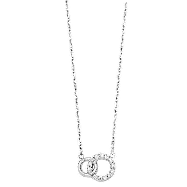 Ce superbe collier en argent rhodié 925/1000è est orné de 2 cercles entrelacés. Un petit cercle lisse et poli et un plus grand cercle serti d'oxydes de zirconium.