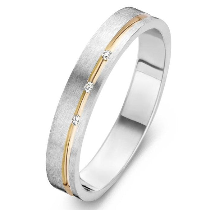 Laissez vous tenter par cette alliance intemporelle en or blanc 750/1000è. Son liseré en or jaune serti de 3 diamants en apesauteur ajoute un superbe contraste à ce modèle classique.