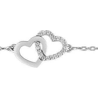 Superbe bracelet en argent et oxydes de zirconium. Un modèle tout en douceur habillé de 2 cœurs entremêlés. Un bracelet à la symbolique forte qui ne pourra plus vous quitter.