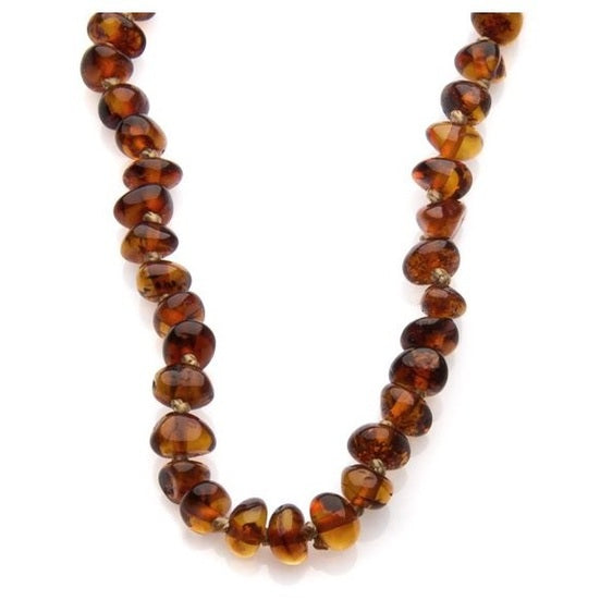 Un collier pour les bébés en ambre couleur cognac. Reconnus pour soulager les poussées dentaires douloureuses des plus petits, ce collier avec un fermoir clip sera le meilleur alliés des enfants les plus jeunes !
