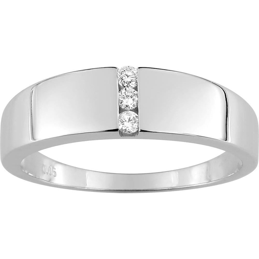 Bague en or blanc 375/1000è au design simple, vous allez adorer la petite touche de luminosité qu'apporte la trilogie de diamants sertis à la verticale centre de la partie la plus large de la bague. Elle est agréable à porter car son corps de bague large à l'avant s'affine petit à petit vers l'arrière.