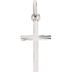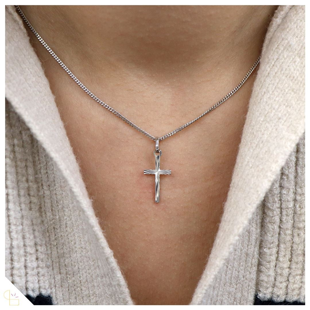 Un pendentif en forme de croix finement travaillé. Ses stries partent toutes d'un même point central et viennent ajouter de l'éclat en reflétant la lumière.