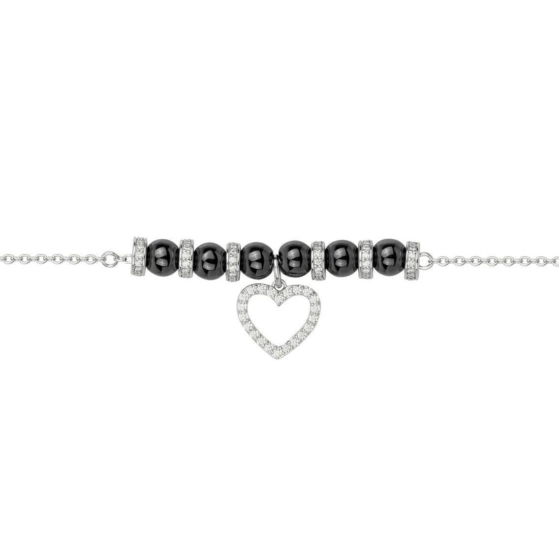 Laissez-vous séduire par ce joli bracelet en argent rhodié 925/1000è alternant billes de céramique noire et disques en argent serti d'oxydes de zirconium. Sa pampille centrale en forme de cœur au contour serti lui aussi d'oxydes de zirconium.