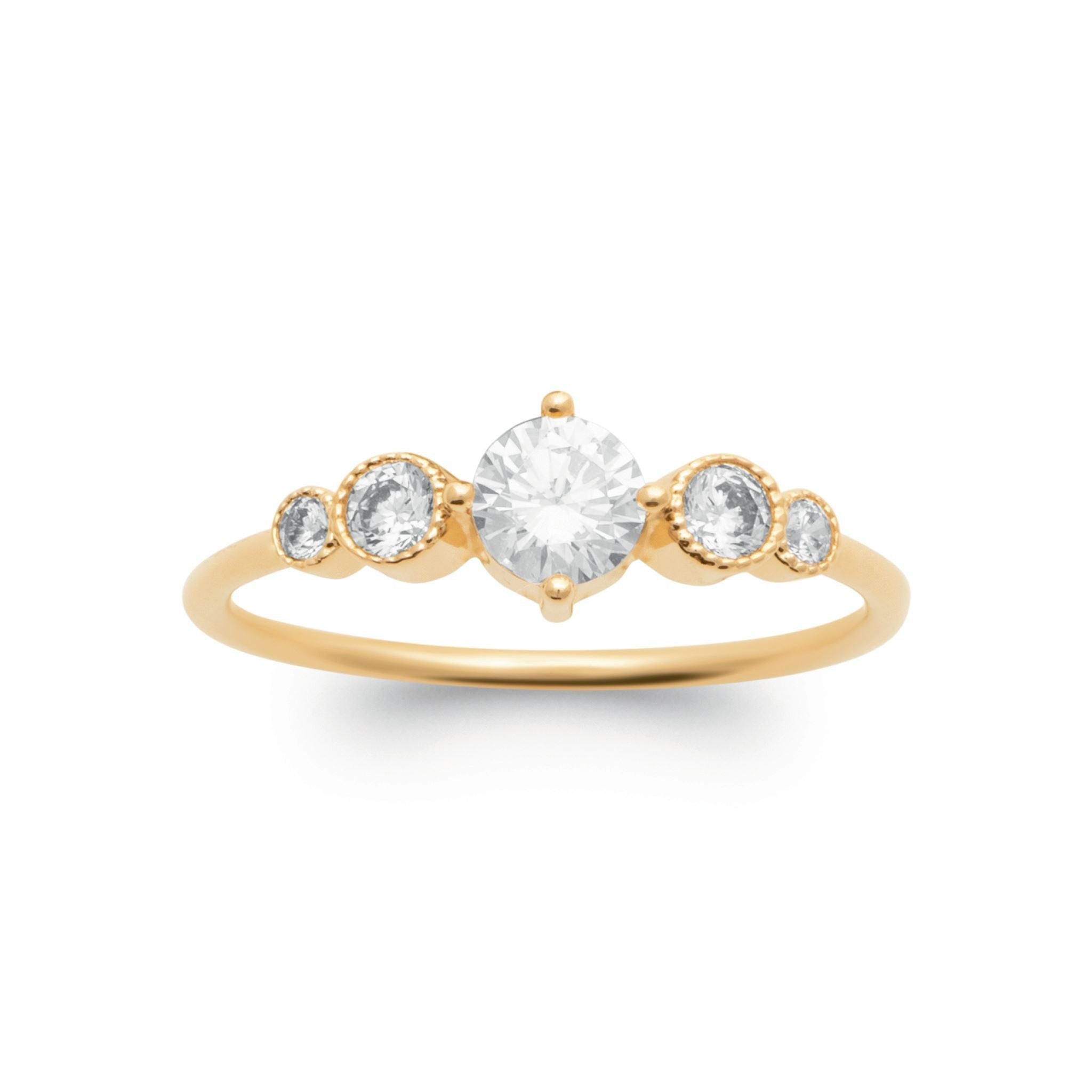 Superbe bague en plaqué or 3 microns et ses 5 oxydes de zirconium brillants. Les 4 oxydes extérieurs sont sertic clos perlés tandis que l'oxyde de zirconium central est serti 4 griffes. Un modèle original et tendance !