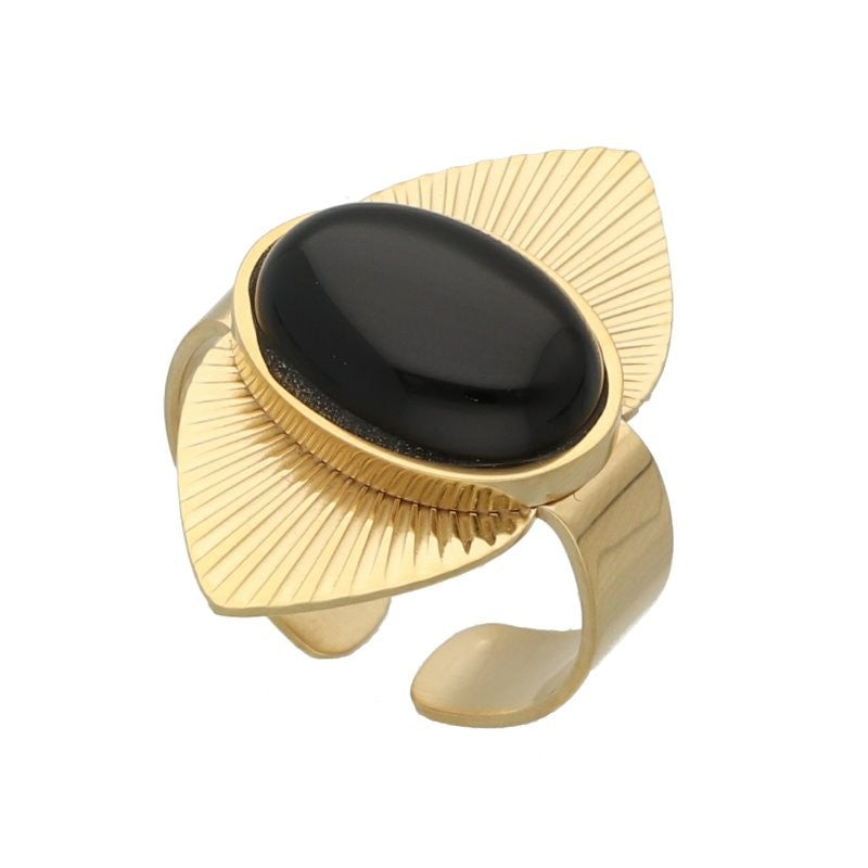 On adore ce modèle de bague en acier doré et sa superbe agate noire ovale. Les extérieurs du modèle sont subtilement gravé de motifs graphiques pour un rendu délicat et tendance.