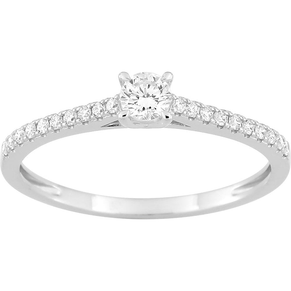 Superbe solitaire accompagné en or blanc 375/1000è et diamants synthétiques. Le diamant synthétique central serti 4 griffes est de 0.15 carats, il est accompagné par 0.12 carats de petits diamants synthétiques sertis sur un corps de bague fin. La bague de fiançaille par excellence !