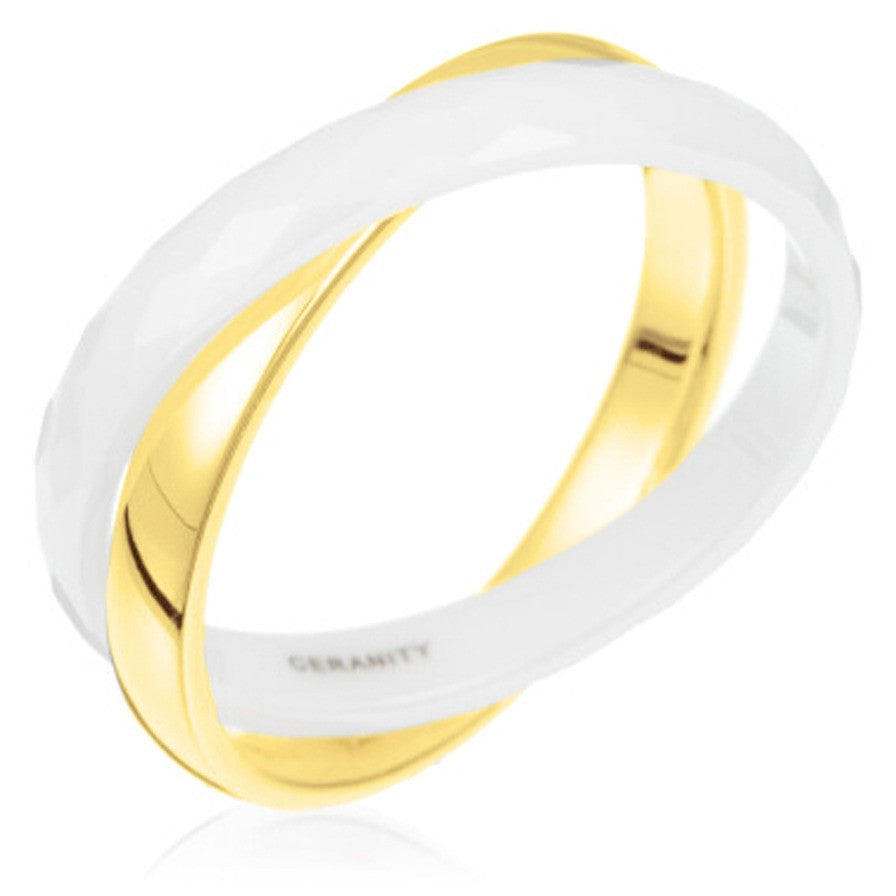 Affirmez votre style avec cette bague contemporaine au design contrasté. Composée de deux anneaux entrelacés, l'un en plaqué or lisse et l'autre en céramique blanche facettée, elle allie audace et élégance. Un bijou graphique et moderne, parfait pour celles et ceux qui aiment se distinguer avec subtilité.