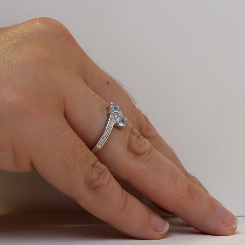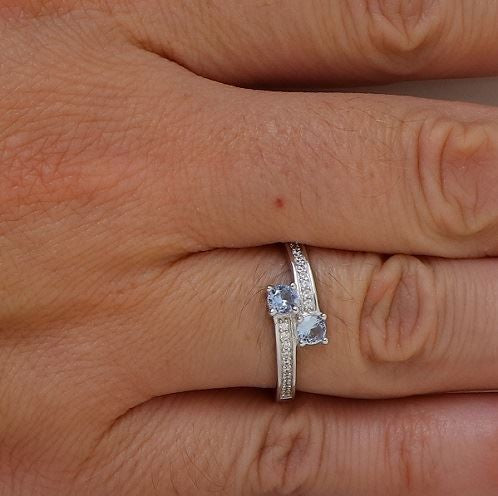 Vous serez sous le charme de cette superbe bague en argent rhodié 925/1000.Son corps de bague est plutôt fin, de 2mm lequel est serti d'oxydes de zirconium blancs. Le style de cette bague « Toi & Moi » fait qu'elle possède donc deux pierres fines : des spinelles bleu clair dont la couleur rappelle celle de la topaze. Les deux branches de la bague s'entrecroisent donc devant afin que les deux pierres centrales se retrouvent côte à côte. Un bijou fin et élégant qui ne vous laissera pas indifférente et qui mettre votre main en valeur.
